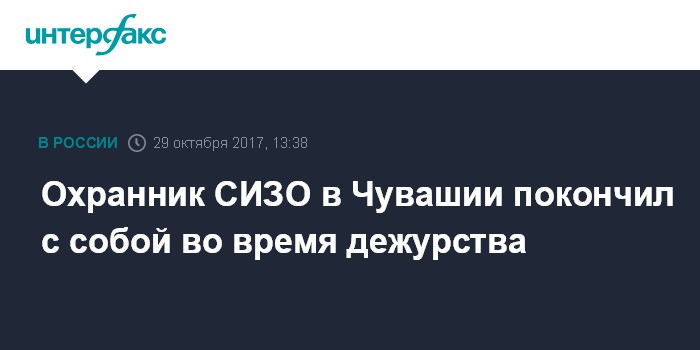 Москва. 29 октября. INTERFAX.RU - В Чувашии начата проверка по факту самоубийства сотрудника охраны СИЗО, сообщает пресс-служба УФСИН по республике.