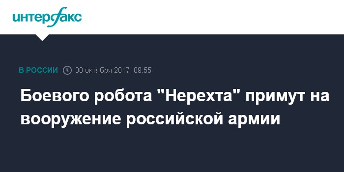 Москва. 30 октября. INTERFAX.RU - Российские военные планируют принять на вооружение боевого робота "Нерехта", сообщил начальник управления инновационных исследований Главного управления научно-исследовательской деятельности (ГУНИД) Минобороны полковник Олег Помазуев.