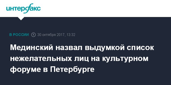 Москва. 30 октября. INTERFAX.RU - Министр культуры Владимир Мединский опроверг сообщения о списке лиц, чье участия в VI Санкт-Петербургском Международном Культурном форуме "нецелесообразно".