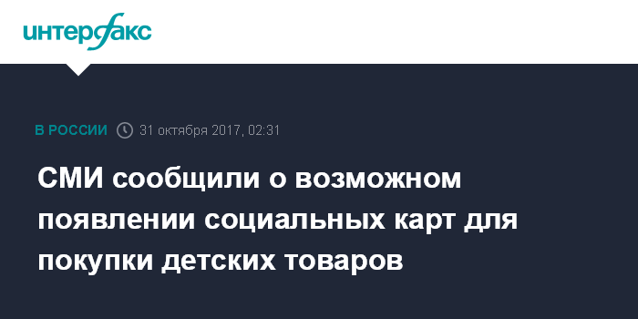 "В 2019 году в России могут появиться социальные карты на детские товары. Государство будет зачислять на них деньги, на которые родители смогут, в частности, приобрести отечественные коляски, одежду, детское питание", - говорится в публикации.