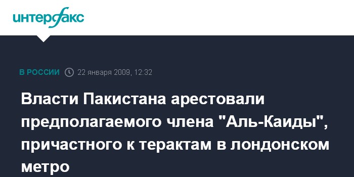 Москва. 22 января. INTERFAX.RU - Пакистанские власти арестовали предполагаемого члена террористической организации "Аль-Каида", причастного к терактам в лондонском метро в 2005 году, заявили власти страны.