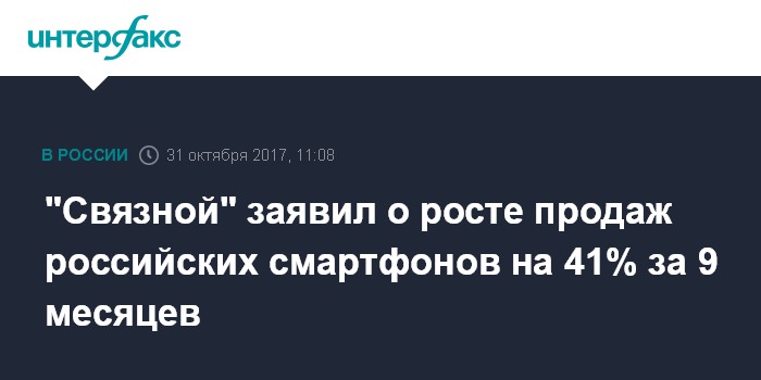 Москва. 31 октября. INTERFAX.RU - Объем продаж смартфонов российского производства за девять месяцев 2017 года вырос на 41% по сравнению с аналогичным периодом 2016 года - до 1,7 млн устройств, говорится в сообщении ритейлера "Связной".