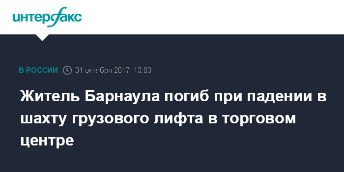 Москва. 31 октября. INTERFAX.RU - Следователи в Алтайском крае проверяют обстоятельства гибели местного жителя, получившего смертельные травмы при падении в шахту грузового лифта, сообщает во вторник пресс-центр регионального следственного управления СК РФ.