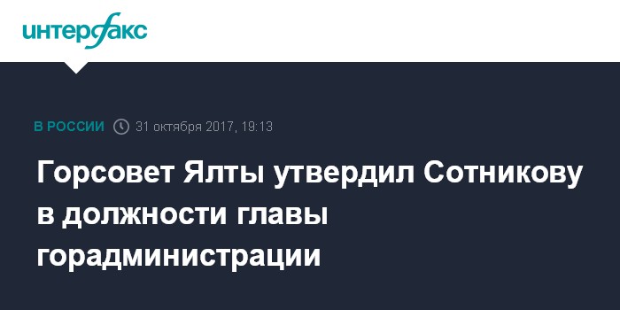 Москва. 31 октября. INTERFAX.RU - Депутаты горсовета Ялты во вторник утвердили Елену Сотникову главой администрации города, ранее больше трех месяцев она была врио руководителя этого органа власти, сообщили "Интерфаксу" в городском совете.