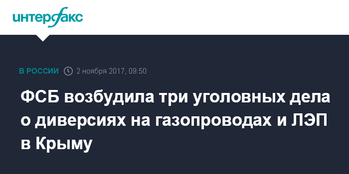 Москва. 2 ноября. INTERFAX.RU - Управление ФСБ России по республике Крым возбудило три уголовных дела по фактам диверсий на двух газопроводах и линии электропередач на юге полуострова.
