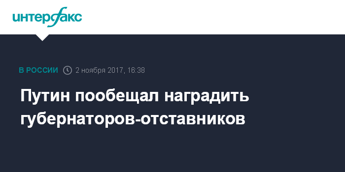 Москва. 2 ноября. INTERFAX.RU - Президент РФ Владимир Путин сообщил, что губернаторы регионов, ушедшие в отставку, будут представлены к государственным наградам, и пообещал, что их опыт будет использован в дальнейшей работе.