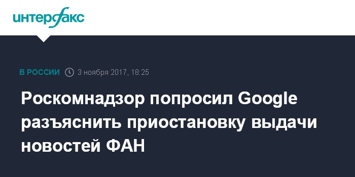 Москва. 3 ноября. INTERFAX.RU - Роскомнадзор выразил Google свою обеспокоенность в связи с тем, что "Google Новости" с конца октября перестал выдавать новостные материалы Федерального агентства новостей (ФАН), сообщили в пятницу "Интерфаксу" в пресс-службе ведомства.