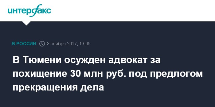 В Тюмени осужден адвокат за похищение 30 млн руб. под предлогом прекращения дела