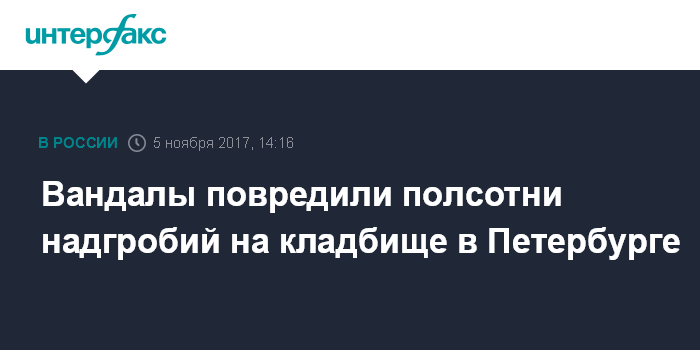 Москва. 5 ноября. INTERFAX.RU - Сотрудники полиции разыскивают вандалов, которые повредили несколько десятков надгробий на Казанском кладбище в Пушкинском районе Петербурга, сообщает пресс-служба ГУ МВД по региону в воскресенье.