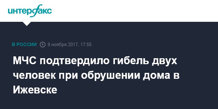 Москва. 9 ноября. INTERFAX.RU - Жертвами обрушения подъезда жилого дома в Ижевске стали два человека, подтвердил первый замначальника Национального центра управления в кризисных ситуациях МЧС РФ Игорь Кутровский.