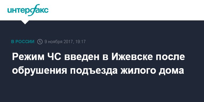 Москва. 9 ноября. INTERFAX.RU - Глава Удмуртии Александр Бречалов ввел в столице республики Ижевске режим чрезвычайной ситуации после обрушения в четверг подъезда жилого дома.