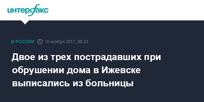 Москва. 10 ноября. INTERFAX.RU - Двое из пострадавших при обрушении жилого дома в Ижевске отпущены из больницы, сообщила журналистам замминистра здравоохранения Удмуртии Татьяна Демина.