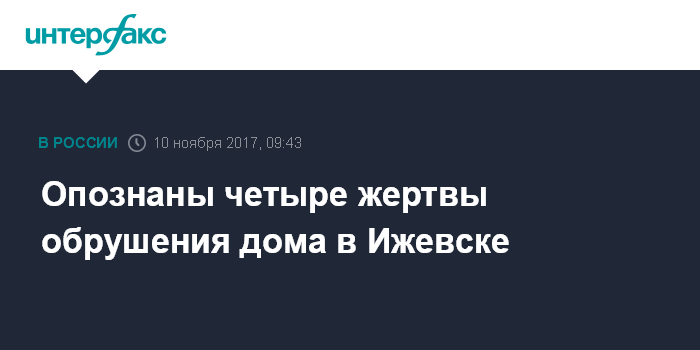 Москва. 10 ноября. INTERFAX.RU - Опознаны четверо из погибших в результате обрушения дома в Ижевске, сообщили "Интерфаксу" в пятницу в бюро судебно-медицинской экспертизы Минздрава Удмуртии.