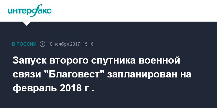 Запуск второго спутника военной связи "Благовест" запланирован на февраль 2018 г .