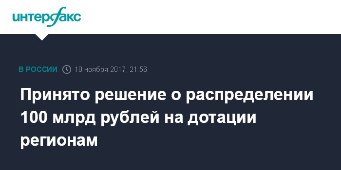 Принято решение о распределении 100 млрд рублей на дотации регионам