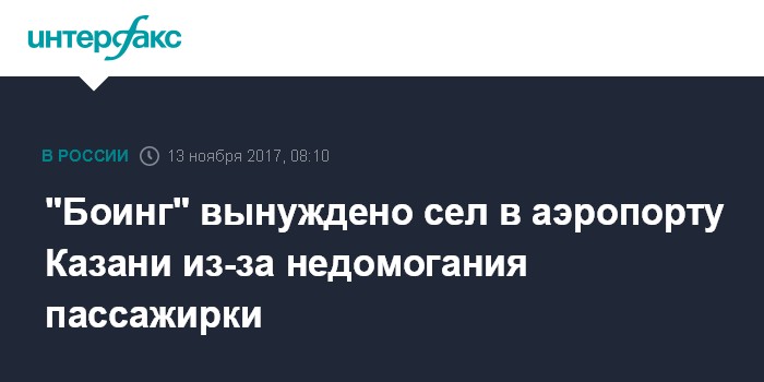 Москва. 13 ноября. INTERFAX.RU - Самолет "Боинг-738" авиакомпании "Сибирь", летевший из Улан-Удэ в Москву, был вынужден совершить вынужденную посадку в международном аэропорту "Казань" для экстренной госпитализации пассажирки.