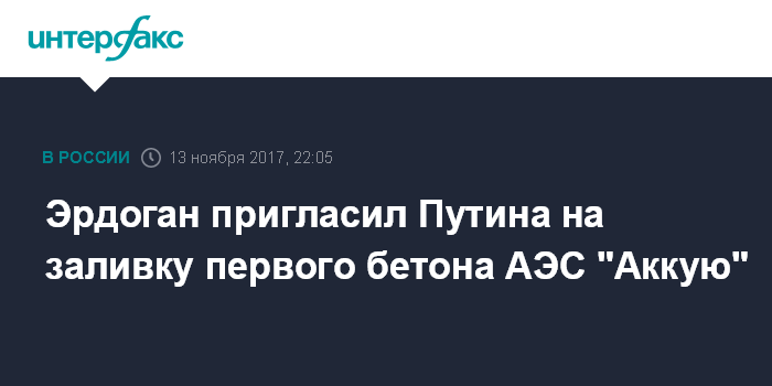 В свою очередь Эрдоган подчеркнул, что Турция придает большое значение своевременной реализации проекта, и пригласил российского президента принять участие в заливке первого бетона АЭС, "если программа господина Путина позволит". Он не назвал дату церемонии, отметив лишь, что она может состояться в "последующие недели".