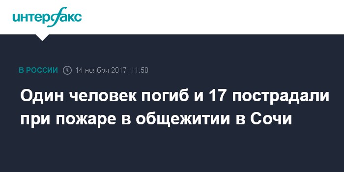 Москва. 14 ноября. INTERFAX.RU - При пожаре в общежитии в Сочи погибла 50-летняя женщина, 17 человек доставлены в больницы, сообщили "Интерфаксу" в управлении городского здравоохранения во вторник
