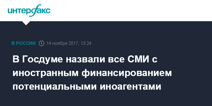 Однако ранее сегодня вице-спикер Думы Петр Толстой, отвечая на вопрос "Интерфакса", не вытекает ли из законопроекта, что все иностранные СМИ станут иноагентами, заявил: "Нет, там критерии, если это юридическое лицо с иностранным участием, или в его пользу перечисляются деньги иностранного государства или государственных органов(...)"