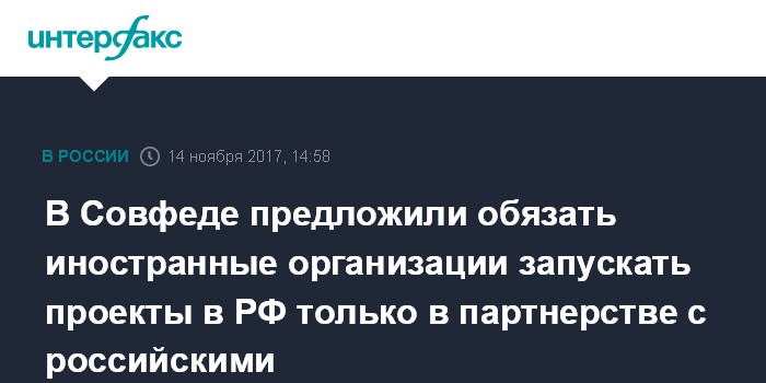 В Совфеде предложили обязать иностранные организации запускать проекты в РФ только в партнерстве с российскими