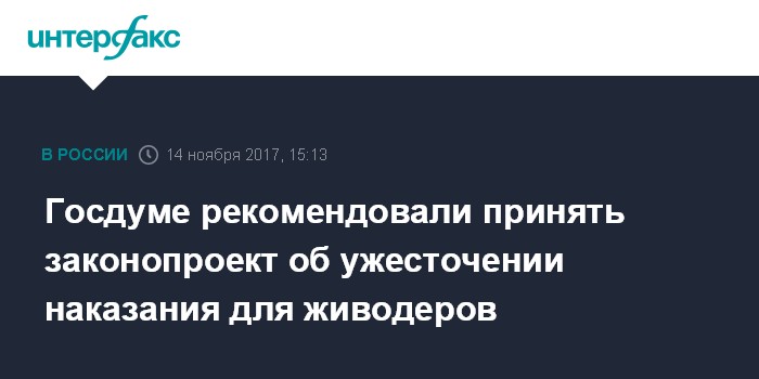 Москва. 14 ноября. INTERFAX.RU - Комитет Госдумы по госстроительству и законодательству во вторник рекомендовал принять в первом чтении законопроект, ужесточающий наказание за жестокое обращение с животными.