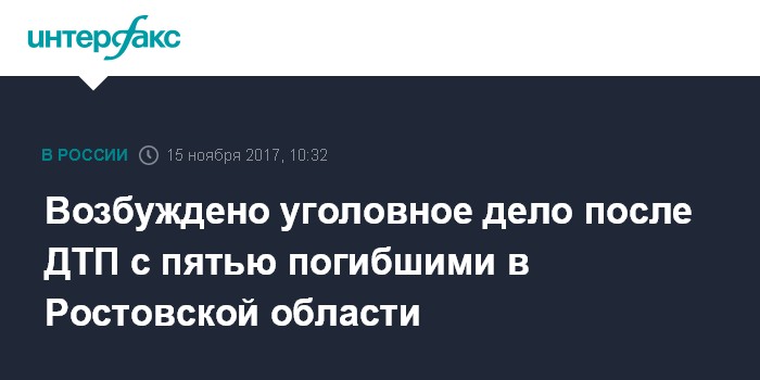 Москва. 15 ноября. INTERFAX.RU - Полиция возбудила уголовное дело по факту дорожной аварии с участием микроавтобуса и грузовика в Ростовской области, где пять человек погибли и шестеро пострадали, сообщила агентству "Интерфакс-Юг" официальный представитель прокуратуры региона Оксана Сухарева.
