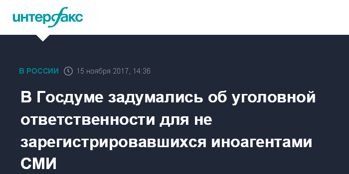 Москва. 15 ноября. INTERFAX.RU - Иностранным средствам массовой информации, которые откажутся регистрироваться иноагентами, может грозить ответственность вплоть до уголовной, заявил депутат Госдумы Евгений Ревенко в программе "60 минут" (телеканал "Россия 1", ВГТРК).