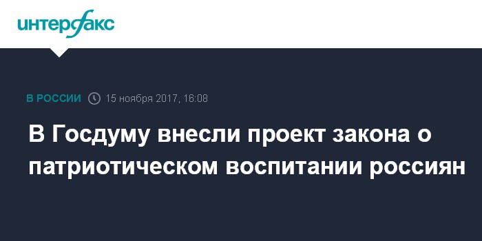 Москва. 15 ноября. INTERFAX.RU - В Госдуму внесен законопроект о патриотическом воспитании граждан РФ. Соответствующая инициатива размещена в базе законодательной деятельности нижней палаты парламента РФ.