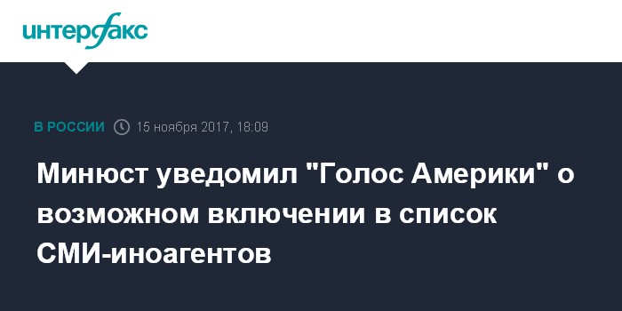 Москва. 15 ноября. INTERFAX.RU - Минюст направил радиостанции "Голос Америки" уведомление о принятых поправках об иноагентах в закон о СМИ и уведомил, что они могут быть распространены на радиостанцию, сообщил информированный источник в ведомстве.