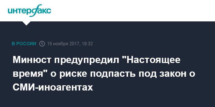 "Телеканал "Настоящее время" вечером 15 ноября получил письмо от Минюста РФ. В нем ведомство сообщает, что в ближайшее время в законную силу могут вступить поправки в законодательство РФ, принятые во втором и третьем чтениях Государственной Думой, в соответствии с которыми предусмотрена возможность признания иностранных СМИ, действующих в России, иностранными агентами", - говорится в сообщении канала, размещенном на его сайте.