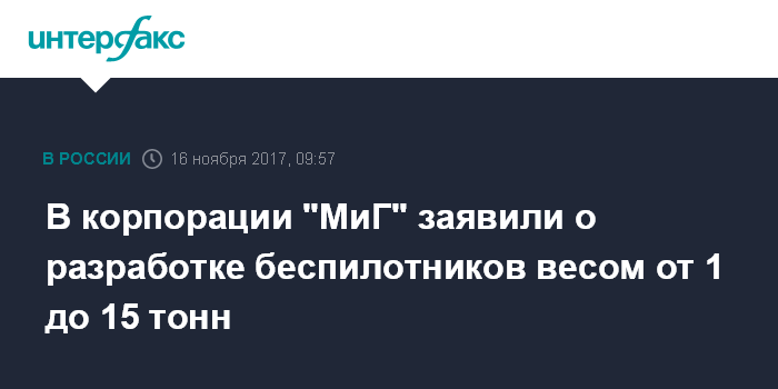Москва. 16 ноября. INTERFAX.RU - Российская самолетостроительная корпорация (РСК) "МиГ" разрабатывает тяжелые беспилотники, сообщил "Интерфаксу" представитель РСК " МиГ".