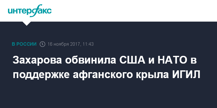 Комментируя появившиеся в СМИ сообщения со ссылкой на представителей властей ряда северных провинций Афганистана о том, что боевики ИГИЛ укрепляют свои позиции в приграничных с Центральной Азией районах, Захарова отметила, что "соответствующие признания недвусмысленно указывают на, к сожалению, покровительство и поддержку боевиков афганского крыла ИГИЛ со стороны войск США и НАТО, в том числе путем транспортировки боевиков на так называемых неопознанных вертолетах, снабжение оружием и т.д.".