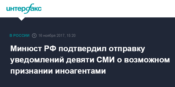 "Минюстом России 15 - 16 ноября 2017 г. в адрес "Голоса Америки", "Кавказ.Реалии", "Крым.Реалии", "Сибирь.Реалии", регионального проекта "IdeL.Реалии", телеканала "Настоящее время", "Радио Свободная Европа/Радио Свобода (РСЕ/РС)", татаро-башкирской службы "Радио Свобода" (Azatliq Radiosi), проекта "Фактограф" были направлены письма о возможном признании их иностранными агентами", - говорится в сообщении Минюста РФ, поступившем в "Интерфакс".