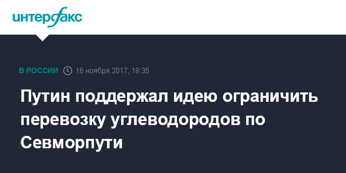 "Вопрос, который я хотел бы поднять - о предоставлении судам, плавающим под российским флагом, исключительного права на перевозку и хранение углеводородов в акватории Северного морского пути", - заявил президент Владимир Путин на совещании по вопросам развития дальневосточного судостроительного комплекса "Звезда" (его транслировал телеканал "Россия 24" (ВГТРК) ).