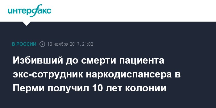 Москва. 16 ноября. INTERFAX.RU - Суд вынес обвинительный приговор бывшему медработнику Пермского краевого наркологического диспансера за избиение пациента, в результате которого тот скончался, сообщается на сайте следственного управления СКР по региону в четверг.