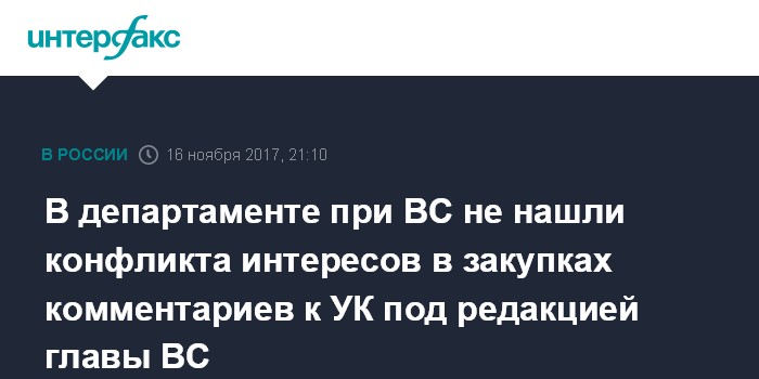 Москва. 16 ноября. INTERFAX.RU - В Судебном департаменте при Верховном суде РФ заявили об отсутствии конфликта интересов при закупке комментариев к Уголовному кодексу РФ под редакцией председателя Верховного суда Вячеслава Лебедева.