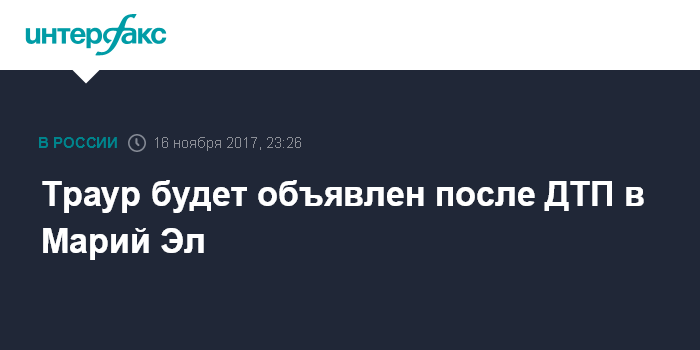 Москва. 16 ноября. INTERFAX.RU - Власти Марий Эл объявят траур после крупного ДТП в республике, в котором погибли пятнадцать человек, еще четверо пострадали.
