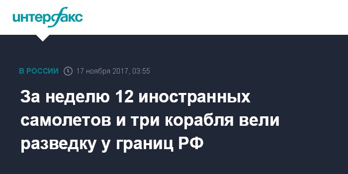 Москва. 17 ноября. INTERFAX.RU - За прошедшую неделю 12 иностранных самолетов и два корабля вели разведку у границ России, сообщили в Минобороны РФ.