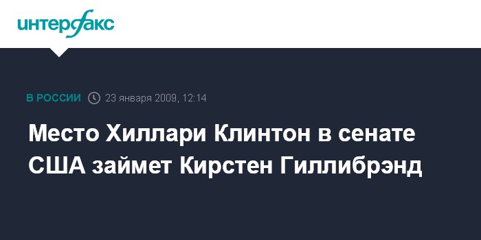 Москва. 23 января. INTERFAX.RU - Место в американском сенате, освободившееся в результате назначения Хиллари Клинтон на пост госсекретаря, займет 42-летняя Кирстен Гиллибрэнд, утверждает в пятницу газета "Нью-Йорк таймс".