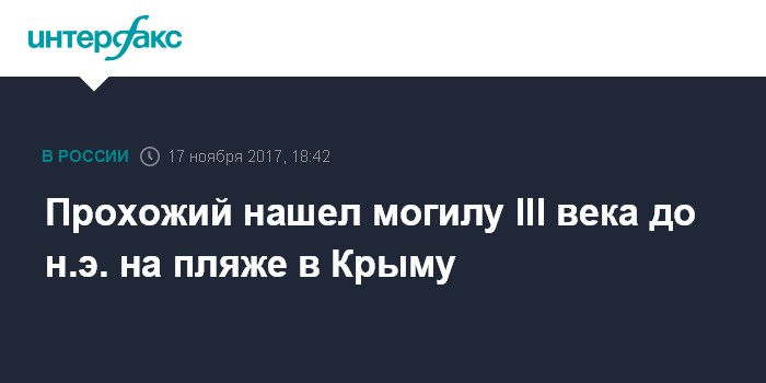 Москва. 17 ноября. INTERFAX.RU -Случайный прохожий обнаружил древнюю могилу на одном из центральных пляжей в курортном городе Евпатория на западе Крыма, сообщили в горадминистрации в пятницу.