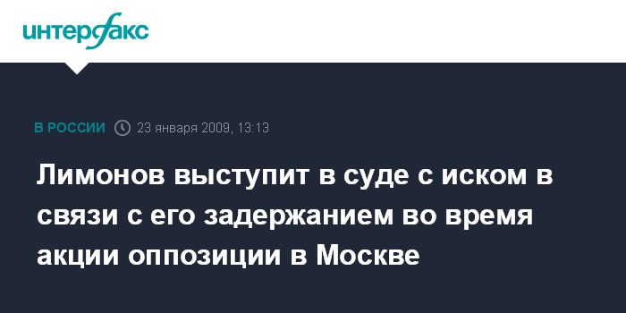 Москва. 23 января. INTERFAX.RU - Сопредседатель оппозиционной коалиции "Другая Россия" Эдуард Лимонов попытается в суде оспорить задержание его правоохранительными органами на декабрьском "марше несогласных", который не был санкционирован столичными властями.