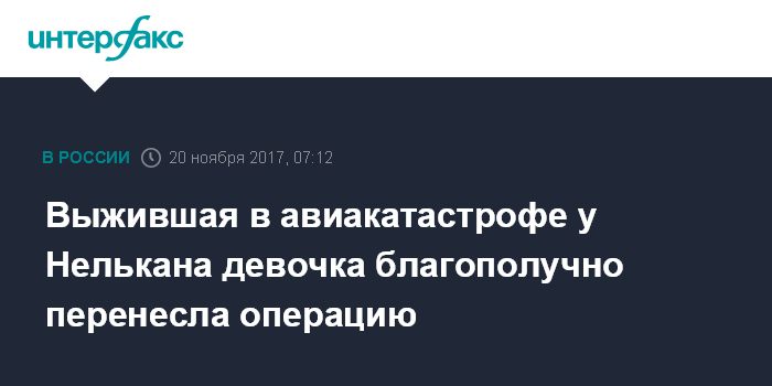 Москва. 20 ноября. INTERFAX.RU - Врачи хабаровской детской больницы прооперировали девочку, получившую переломы при падении самолета L-410 у села Нелькан.