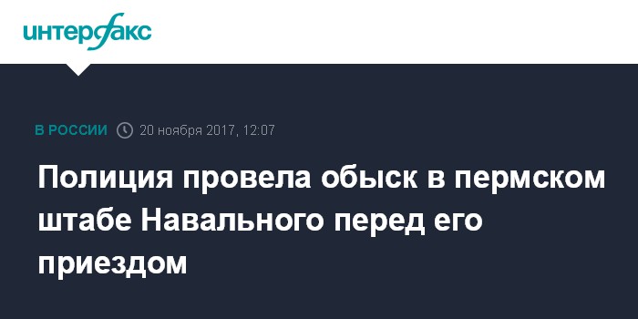 Москва. 20 ноября. INTERFAX.RU - Сотрудники полиции провели обыск в штабе Алексея Навального в Перми, заявила агентству "Интерфакс" координатор штаба Наталья Вавилова в понедельник.