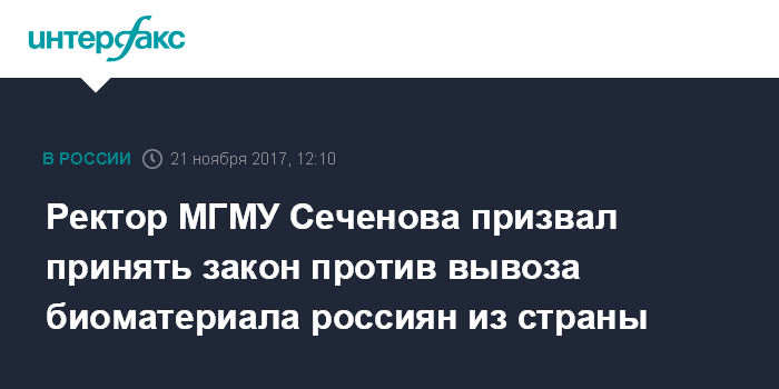 Москва. 21 ноября. INTERFAX.RU - Вопрос о вывоз биологических материалов Россиян должен быть как можно скорее урегулирован законодательством, считает ректор Первого МГМУ Сеченова Петр Глыбочко.