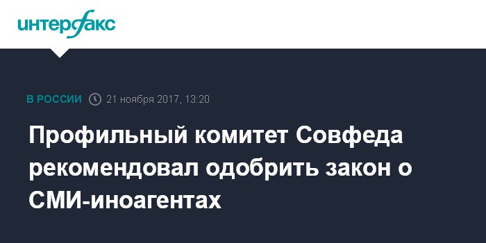 Москва. 21 ноября. INTERFAX.RU - Комитет Совета Федерации по конституционному законодательству и госстроительству рекомендовал верхней палате одобрить закон о СМИ-иноагентах.