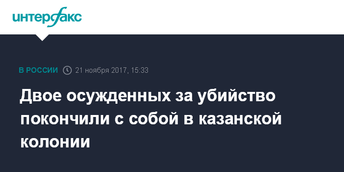 Москва. 21 ноября. INTERFAX.RU - Двое мужчин, отбывавшие длительные сроки наказания в казанской колонии строгого режима №19, покончили с собой с разницей в несколько дней, сообщил заместитель председателя Общественной наблюдательной комиссии Татарстана Азат Гайнутдинов.