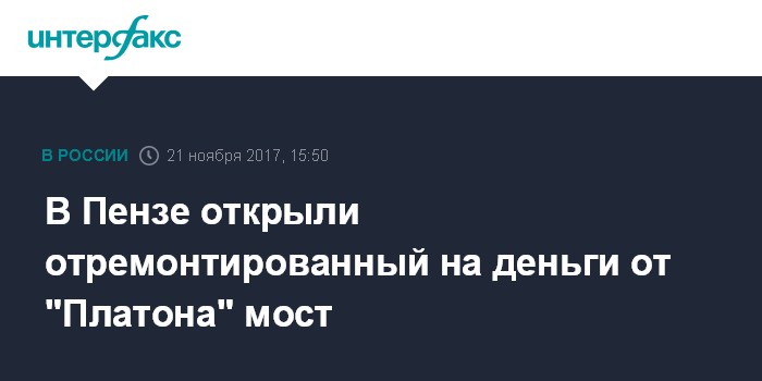 "Реализовать этот проект удалось в короткие сроки за счет средств системы взимания платы "Платон". Пензенская область получила на реконструкцию этого объекта около 400 млн рублей... В этом году в области введен в эксплуатацию еще один объект за счет средств системы "Платон" - путепровод в городе Каменке", - приводятся в сообщении пресс-службы слова министра транспорта РФ Максима Соколова, принимавшего участие в церемонии открытия.