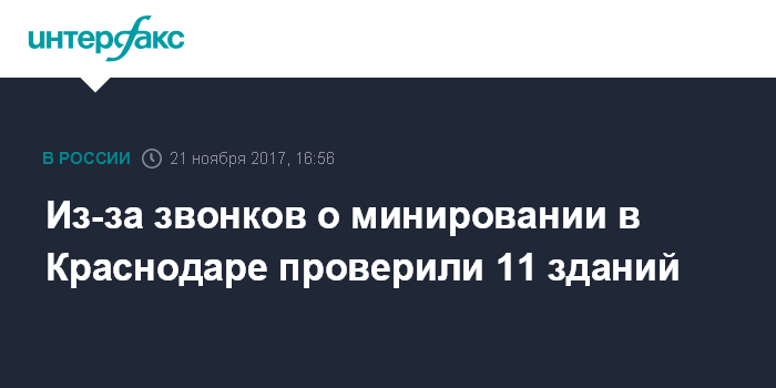 Москва. 21 ноября. INTERFAX.RU - В Краснодаре во вторник из-за звонков о минировании проверили 11 зданий, сообщили агентству "Интерфакс" в пресс-службе администрации города.