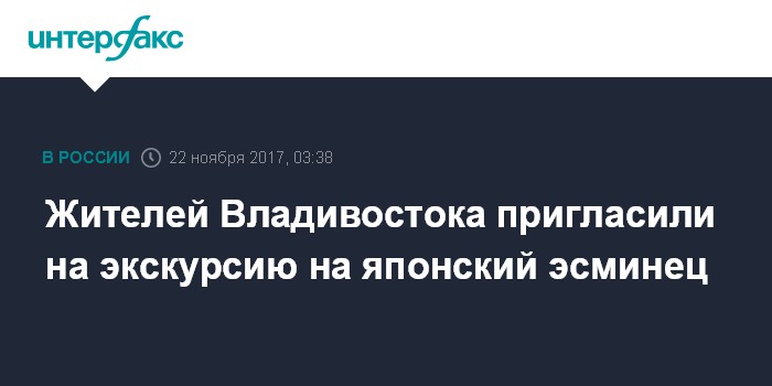 "Все желающие смогут посетить эскадренный миноносец, пришедший во Владивосток с неофициальным визитом, осмотреть его вооружение, а также в ходе экскурсии ознакомиться с условиями службы и быта военных моряков Японии", - сообщил агентству "Интерфакс - Дальний Восток" представитель Тихоокеанского флота (ТОФ) Николай Воскресенский.