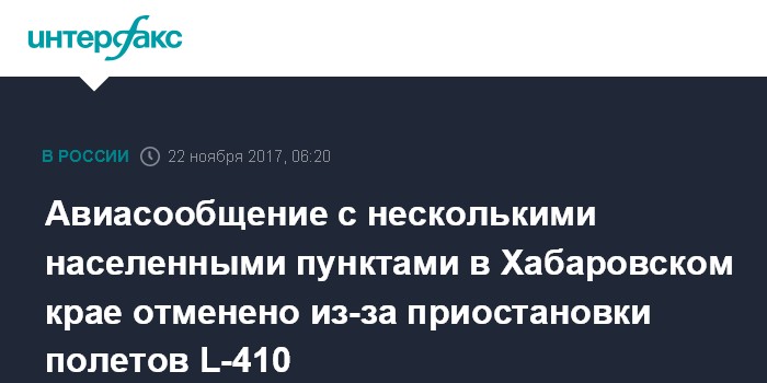 Москва. 22 ноября. INTERFAX.RU - Самолеты не будут летать в четыре населенных пункта Хабаровского края после приостановки эксплуатации L-410 на маршрутах в регионе из-за крушения такого же воздушного судна у села Нелькан.
